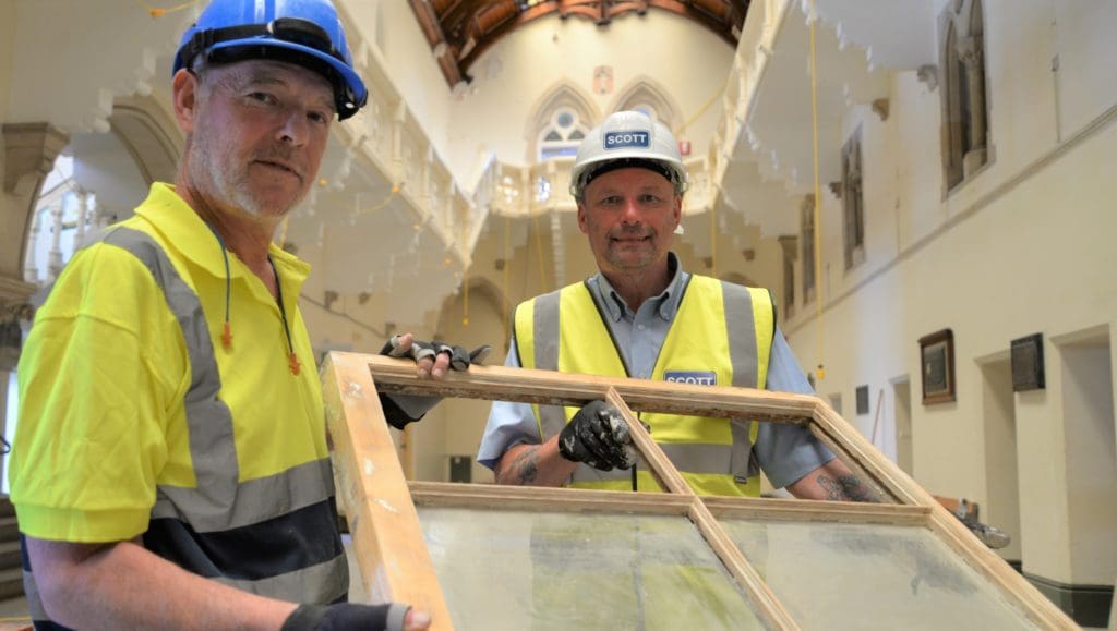 Cardigan based heritage carpenter Gary Davies (left) and Leighton Brown, Project Manager with Andrew Scott Ltd with one of the original windows from the Georgian Villas. The Old College features 664 windows, set in stone, steel and wooden frames.