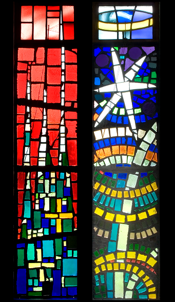 The windows were created in 1968 by Jonah Jones, who was a leading figure on the Welsh arts scene in the second half of the 20th century. Best known for his sculpture and watercolours, Jones was also part of a group of pioneering artists in Europe in the 1960s using the new technique of dalle de verre – slab glass supported in a concrete or resin matrix – who learned as they worked, creating daringly innovative work in the process.