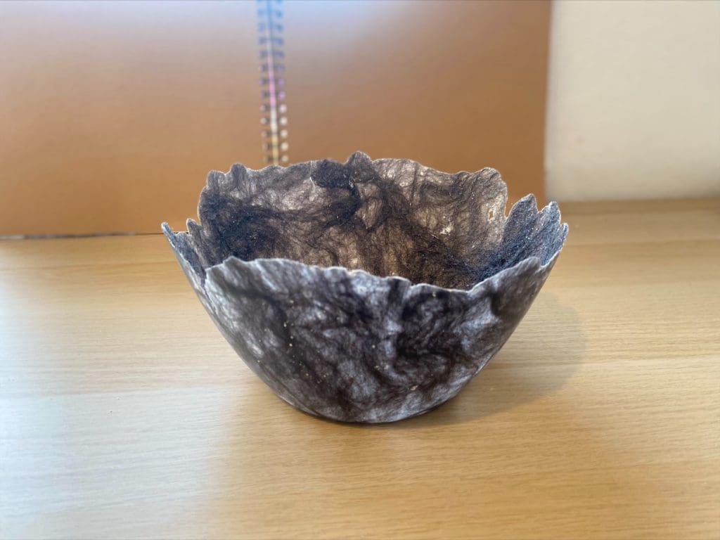 Leanne said, “By breaking seaweed down and layering the wool together, it gives the material a composite structure which provides strength and durability. Adding a thin layer of epoxy makes the material water resistant and food safe, meaning it has even more uses. This process could be used for all sorts of day-to-day products and I focussed on kitchen items, specifically a fruit bowl. I’ve never worked with wool or seaweed, so the project has made me appreciate that any material can become something else, and products can be created out of virtually any material. Wool is in abundance, and this project has proved it can have a different purpose and can be a versatile and sustainable material.”