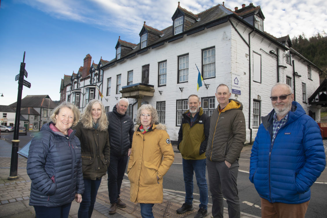 Members of Corwen Partnership who plan to turn the historic Owain Gyndwr Hotel in the town into a community enterprise, from left, Secretary Helen Counsell, Lisa Carson, Tish Aldridge, Denbighshire County Councillor Alan Hughes, Steve Bennett, Dylan Jones and Chairman David Counsell. Picture by Mandy Jones Photography.