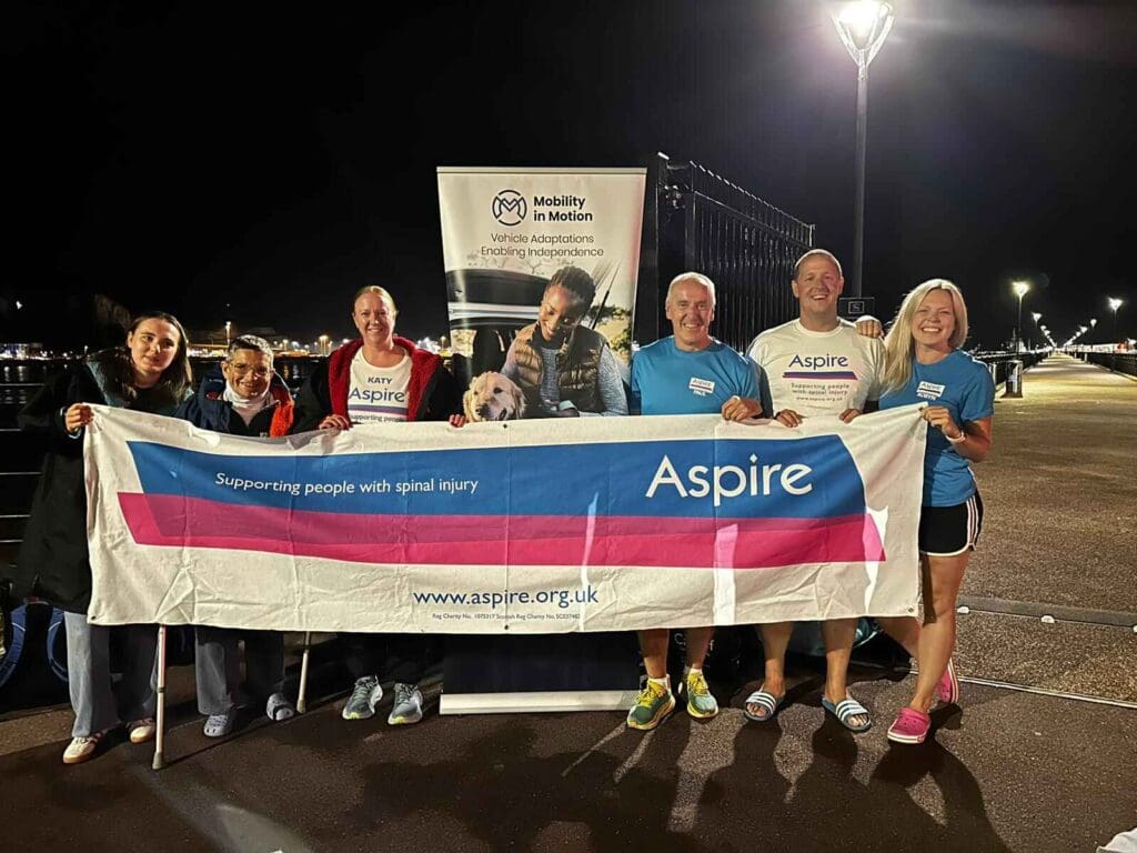 On Sunday 4th August 2024, Eleanor joined Aspire’s 100th relay boat in an attempt to repeat her original feat.  She had to swim in the pitch dark, in cold, churning seas (the team are a few pounds lighter in weight this morning) and dodged jellyfish all the way to France. On top of this, Eleanor had to climb on and off the Channel boat in rolling seas and at one stage did this in the pitch blackness of night. It is a terrifying experience for anyone and so doing this with a spinal injury required huge bravery. The six strong team finally touched down at Cap de Gris Nez on the French coast after swimming for 12 hours 59 minutes.
