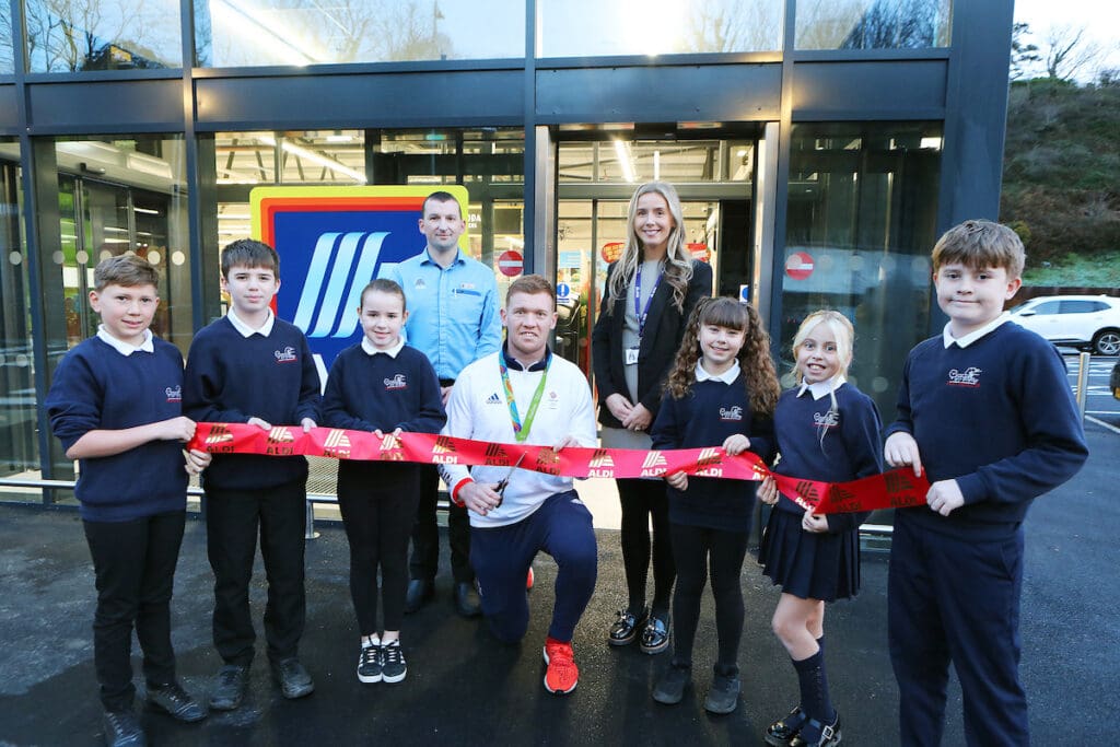 A brand-new Aldi store in Pwllheli opened its doors to customers this week, with Team GB rugby hero Sam Cross cutting the all-important red ribbon alongside pupils from Ysgol Abererch.