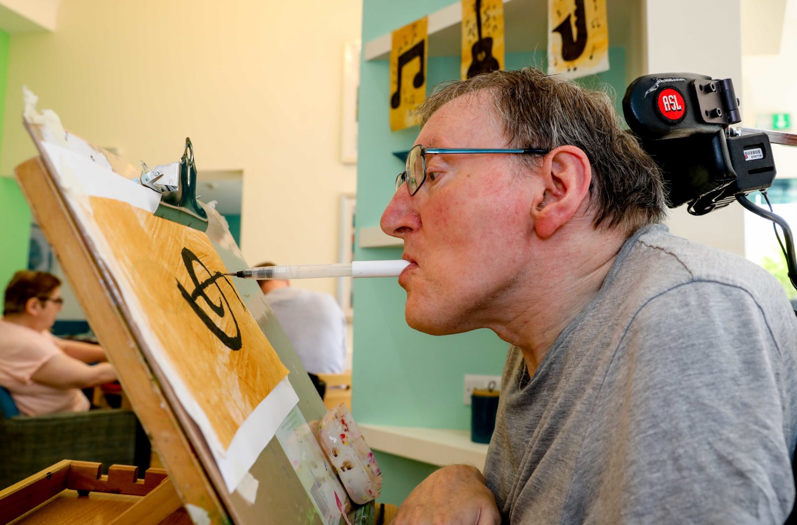 The paintings he produces are created with the paintbrush in his mouth, a technique he decided to pursue following discussions with Sarah.