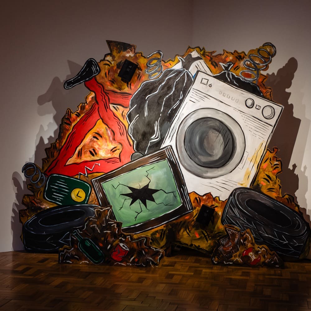 It features creative interpretations of artefacts such as used tyres, an old washing machine and an unwanted old radio. There are black bags and disused springs.