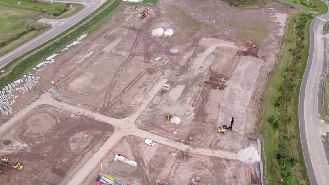 The drone film shows work being undertaken on Anwyl Homes’ Summers Bridge development on the former RAF Sealand site in Deeside.