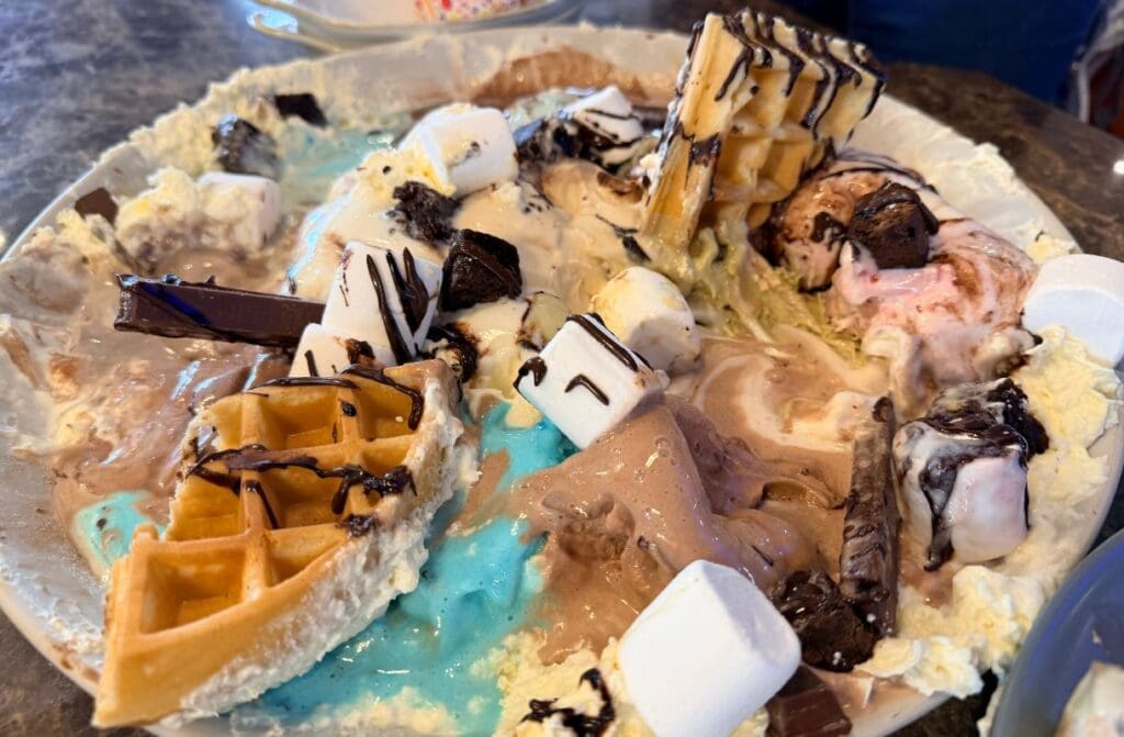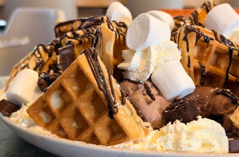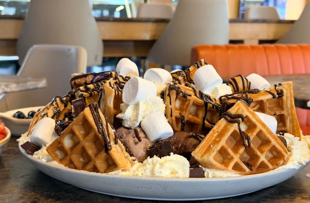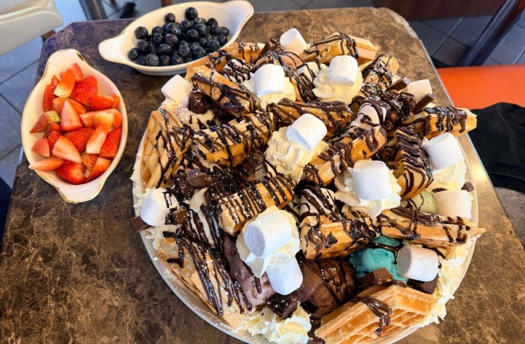 You get 18 scoops of gelato sitting proudly on top of four hot waffles, finished with fresh fruit, chocolate bars of your choice, and as many toppings and sauces as you dare. It arrives at your table like a sugary centrepiece. Heads turn. Cameras come out. Regret usually follows.