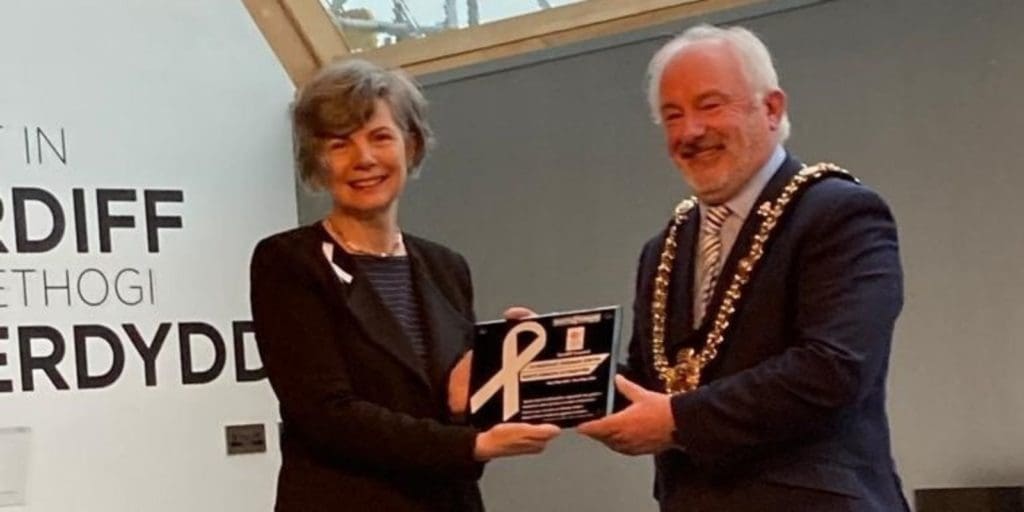 In a special event at Cardiff Castle yesterday, the Lord Mayor of Cardiff, Cllr Graham Hinchey accepted a plaque celebrating the achievement from Anthea Sully, Chief Executive of White Ribbon UK.