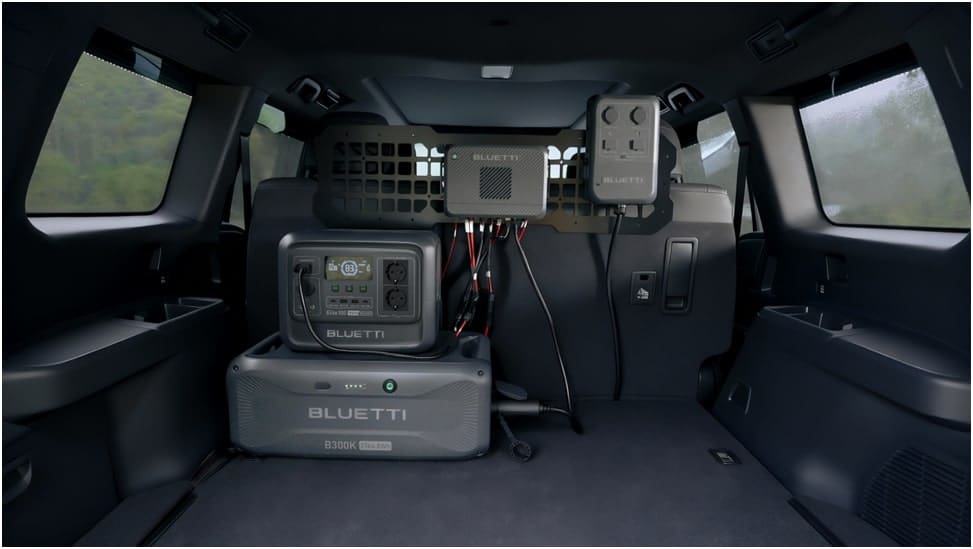 The BLUETTI Charger 2 Unified Car & Solar Smart Energy Hub is installed in the rear cargo area of an SUV. It is designed for easy installation in a variety of vehicles, including pickup trucks, camper vans, and Class C/B RVs.