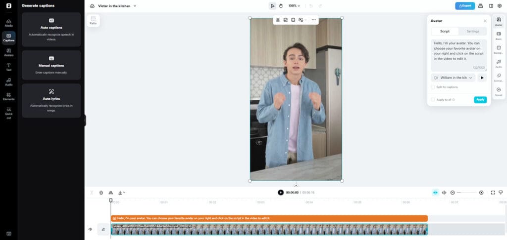 Click “Edit script” to input or adjust dialogue while previewing how it fits different scenes. You can work in multiple languages and instantly see how the avatar adapts. Use “Change caption style” to align text with new backgrounds and scene moods.