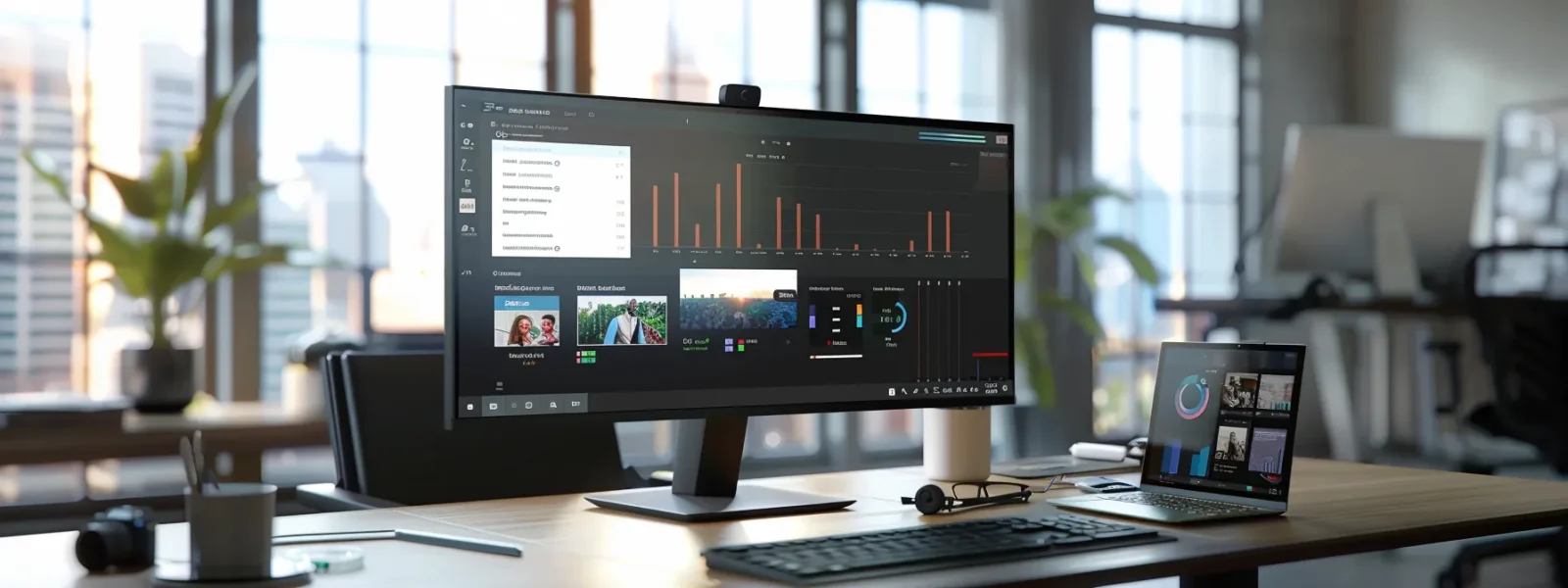 Alt text: A modern computer monitor on top of an office desk, showcasing the use of customer reference software solution.