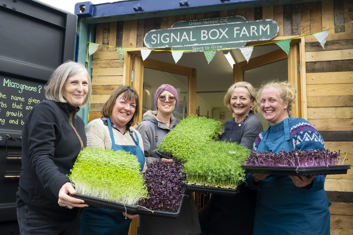 One of the funded organisations was Urban-Vertical CIC, who ran free ‘Farm to Fork’ workshops in Splott, showing participants how to easily grow sustainable microgreens to supplement their diets. A farm tour and talk detailed how vertical farming can help to reduce the impacts of climate change and tackle cost of living rises; participants were then invited to use the new community growing area in one of the converted shipping containers at Signal Box, to sow and grow their own crops.