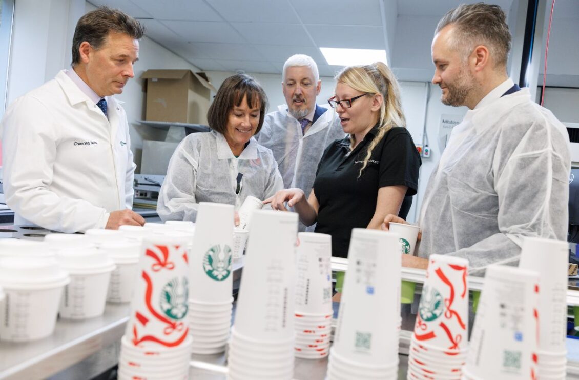 Cydweithiodd y ddau gwmni ar Ymchwil a Datblygu ac arloeseddau gweithgynhyrchu helaeth i ddatblygu fersiwn newydd o gwpan wen eiconig Starbucks, a lansiodd ledled Ewrop yn yr haf, a bydd yn dod yn o fuan i’r Deyrnas Unedig.  Daeth rhan o’r cyllid ar gyfer datblygu’r cynnyrch newydd hwn oddi wrth Gyfalaf Buddsoddi mewn Arloesi gan Brifddinas-Ranbarth Caerdydd yn 2024. Gwnaeth Dirprwy Arweinydd Cyngor Bwrdeistref Sirol Caerffili, y Cynghorydd Jamie Pritchard, a’r Prif Swyddogol Gweithredol, Ed Edmunds, hefyd fynychu’r ymweliad.