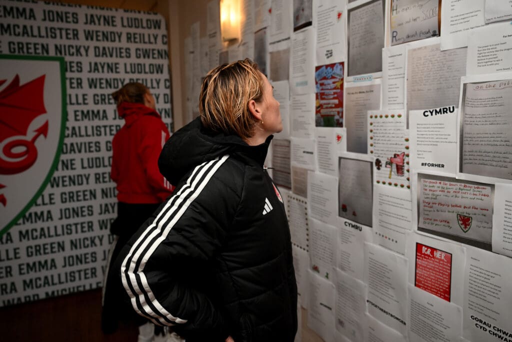 The Cymru squad, including, Cymru Manager Rhian Wilkinson and Cymru players Angharad James, Jess Fishlock, Hayley Ladd, Kayleigh Barton and many more, were surprised with the creative efforts of Wales’ creative children.
