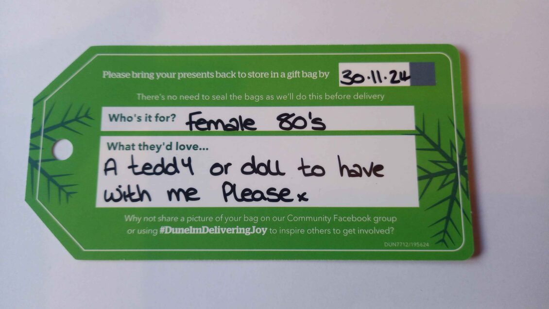 Dunelm colleagues work with local care homes, schools, refuges and charities to gather gift requests, creating tags that include the recipient’s gender, age and choice of gift.