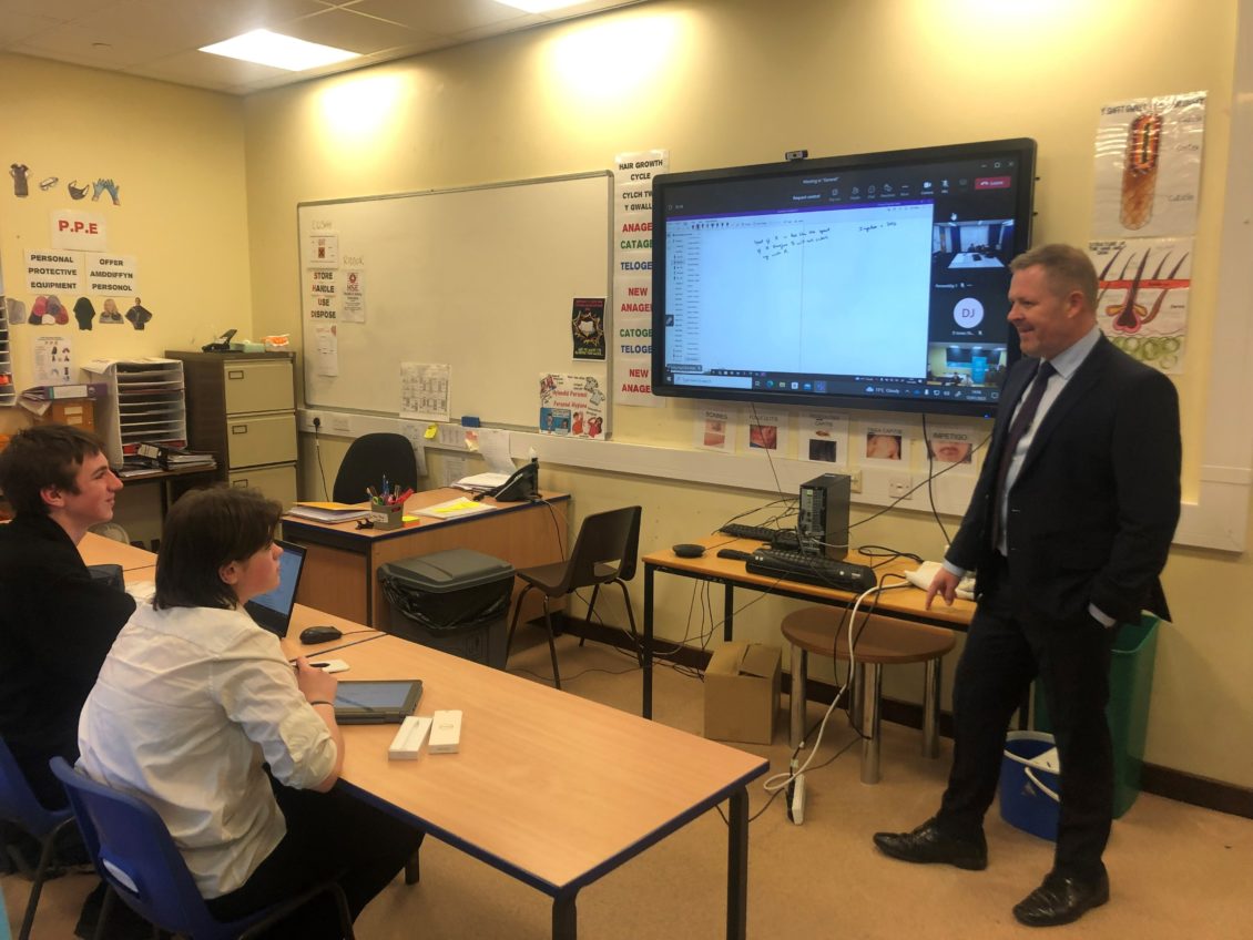 During the visit the Minister saw how the Foundation Phase pupils are developing their Welsh language skills. Mr Miles also observed an E-sgol lesson where a few Year 12 pupils were studying Further Maths via the project. Following this lesson, staff and pupils had the opportunity to talk to the Minister about their experience with the E-sgol project.