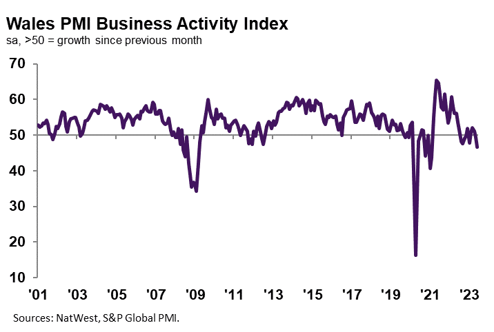 The headline NatWest Wales Business Activity Index – a seasonally adjusted index that measures the month-on-month change in the combined output of the region’s manufacturing and service sectors – registered 46.7 in June, down from 49.4 in May. The latest data signalled a solid contraction in output at Welsh firms, and the fastest fall in activity since February 2021. Economic uncertainty, hesitancy among customers and reports of destocking at clients drove the decline, according to panellists. The decrease in business activity in Wales contrasted with the trend for the UK as a whole, where output rose at a solid pace. In fact, Welsh firms recorded the weakest performance of the 12 monitored UK areas.