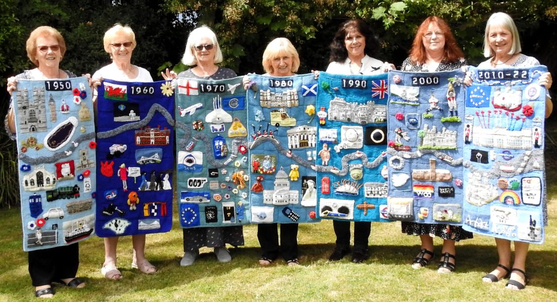 The Bramley knitters then wanted another project and the Queen’s Jubilee seemed a suitable topic. The seven decades are represented on separate smaller panels to create memories of the 70 years.