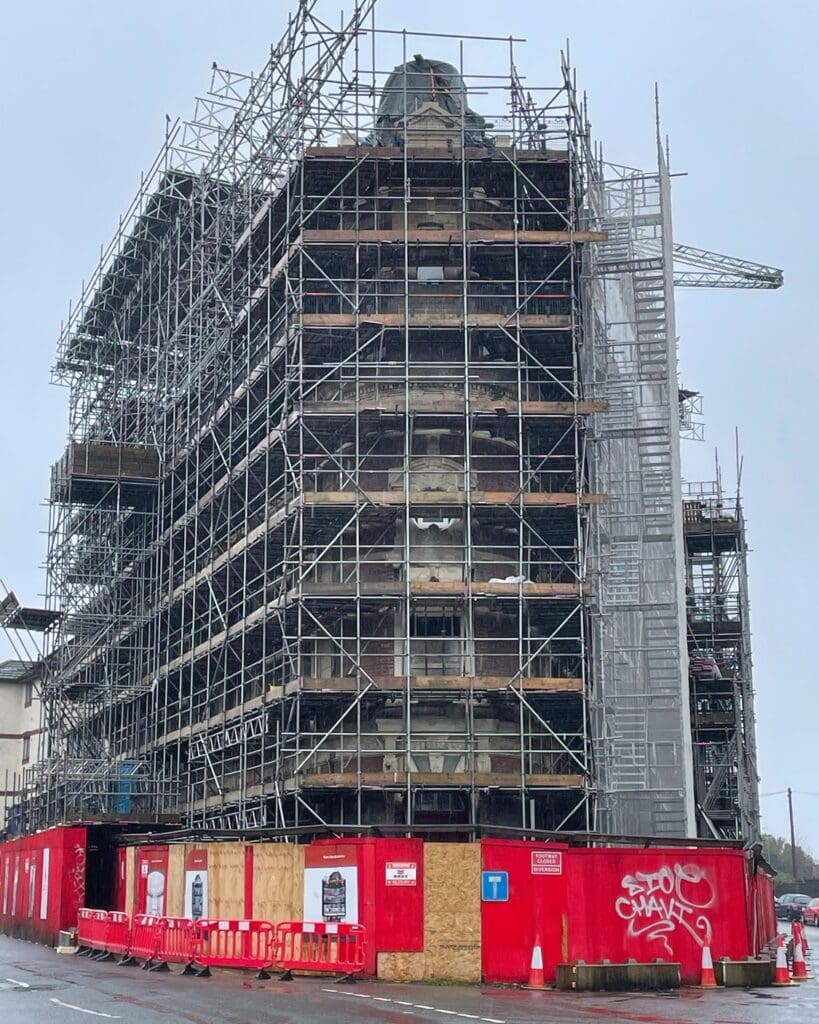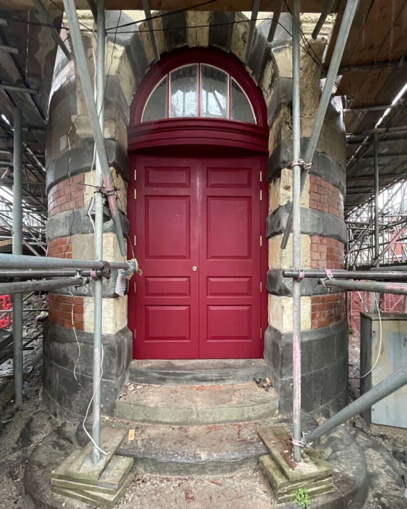 A restored entrance door is now visible along with glimpses of expertly refreshed stonework through the tall scaffolding that’ll come down in the coming weeks.