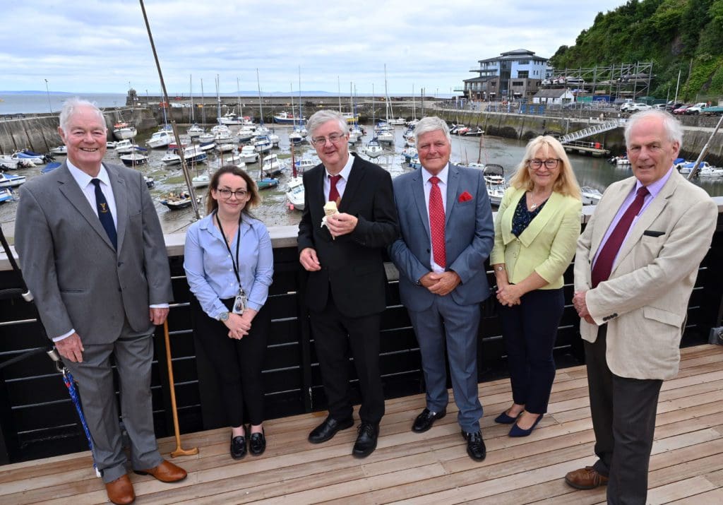 First Minister Mark Drakeford took time to enjoy an ice-cream on Saundersfoot Harbour as he visited the impressive new Wales International Coastal Centre that will fully open in 2023.