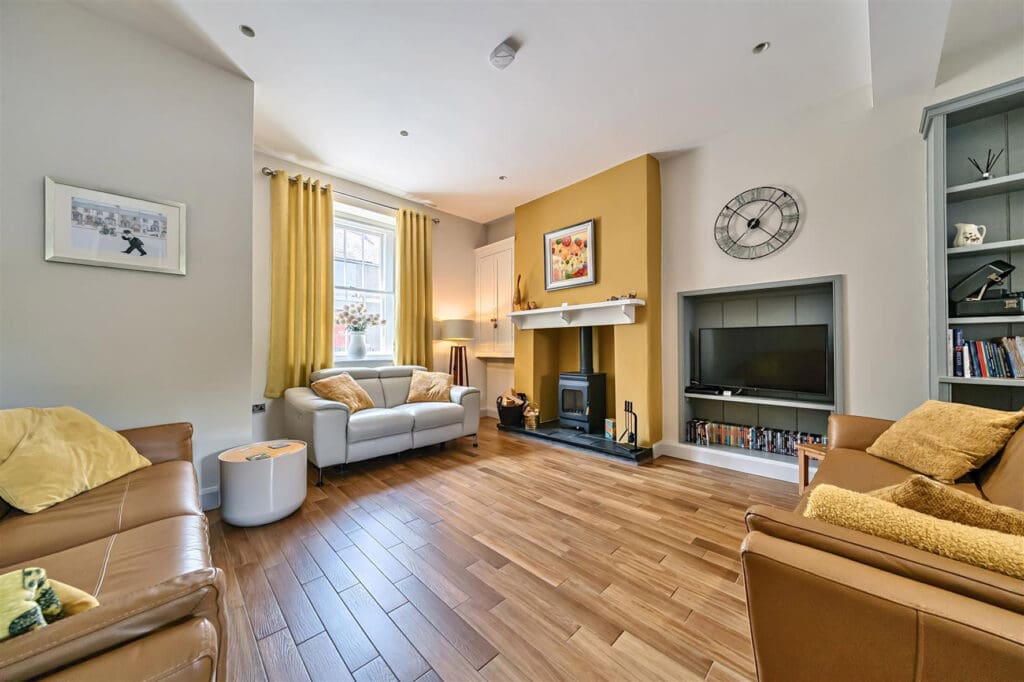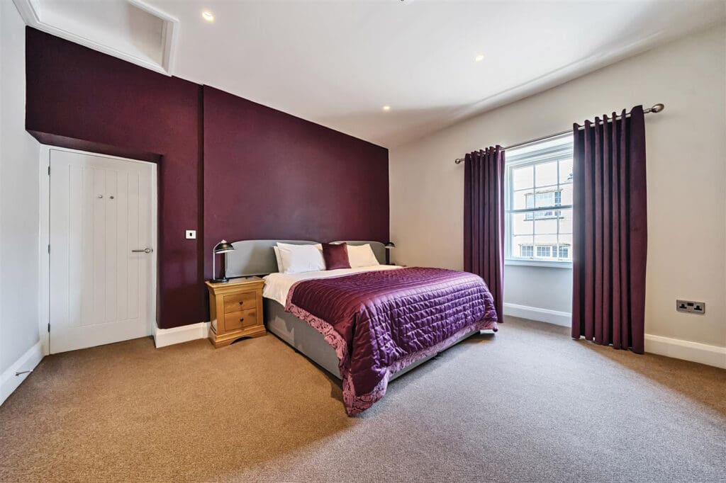 The Court House, formerly the town’s County Court, is a striking building converted into a high quality, two-bedroomed home featuring a spectacular, double-height lounge with exposed beams, full-height windows and a wood-burning stove and open-plan kitchen and dining area.