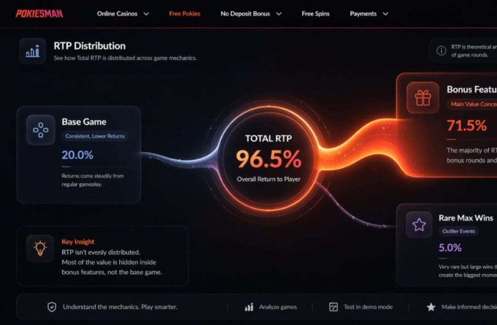 Aussie players note that published RTP figures rarely match their base game payout experiences. It happens because RTPs are aggregate values that include all game states, as explained in the return to player (RTP) concept , without distinguishing among base spins, free-spin features, bonus buys, and jackpot cycles. Numbers published on games’ info pages don’t reflect payout distribution. The nuance is called feature weighting – disproportionate distribution of returns during base game hits versus bonus rounds.