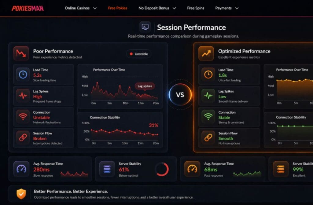 Australian 5G networks allow a standard pokies app to load in under 2 seconds. Anything less is a technical red flag. The 2-second threshold indicates asset file adequacy and optimised CDN delivery. Slow apps often run on ageing RGS backends, leading to challenges supporting concurrent sessions. Today, load time is a proxy for infrastructure quality, a parameter that determines uptime reliability and payout processing speed in real-money gambling environments. Each is critical for user experience and trust in casino operators. Free pokies app testing on mobile goes beyond aesthetic appraisal. It measures whether operators’ backends perform well under realistic AU network conditions. Titles lagging at bonus trigger moments in free pokies sessions aren’t that critical, but identical lags in real money gameplay can cause irritating financial losses.