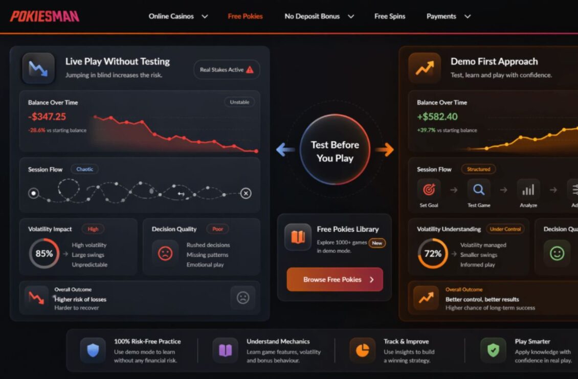 An example best illustrates the value that free online pokies and play free pokies sessions provide for game and casino pilot testing. A key insight from industry practice is that free online pokies function as a primary reference environment for structured testing, allowing players to analyse gameplay behaviour, volatility patterns, and feature frequency before entering real-money sessions. Imagine a Melbourne-based player who just lost AU$500 in welcome bonuses by triggering a bonus round in a high-volatility pokie they barely knew. Winning odds are incomparably higher with a three-scatter trigger at low frequency, once every 200 spins, which players would capture after 30 minutes of demo play. Landing with a non-withdrawable bonus after resetting wagering conditions is a preventable loss. Such loss patterns repeat at Australia-facing casinos. Audited performance data from licensed operators point to higher rates of early bankroll depletion among players who skip demo gameplay testing. Data audits from top-tier free online pokies providers confirm the trend: mechanical unfamiliarity leads to suboptimal play, resulting in financial losses under standard circumstances.