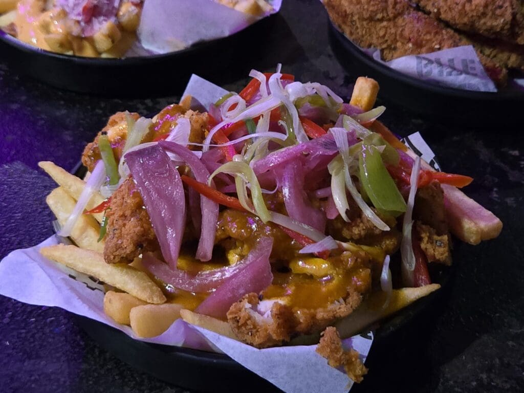 A punchy twist on comfort food, these fries are blanketed in velvety, aromatic katsu curry sauce and topped with tender chicken. A vibrant salt and chilli mix adds a hint of spice, while candied red chillies deliver a sweet burn. The pickled red onions offer a bright, vinegary zing, and spring onions bring a fresh, peppery crunch. It’s a flavour bomb of creamy, spicy, tangy, and savoury — all in one.