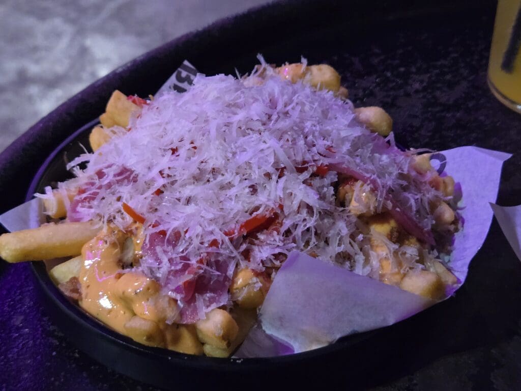 These indulgent fries are layered with smoky, creamy baconnaise and scattered with crispy bacon bits, adding a rich, meaty depth. Crunchy fried onions bring a touch of sweetness, while sharp pickled red onions cut through with tangy contrast. A generous snowfall of grated parmesan crowns it all with a nutty, savoury punch — making each forkful a satisfying medley of textures and bold, layered flavours.