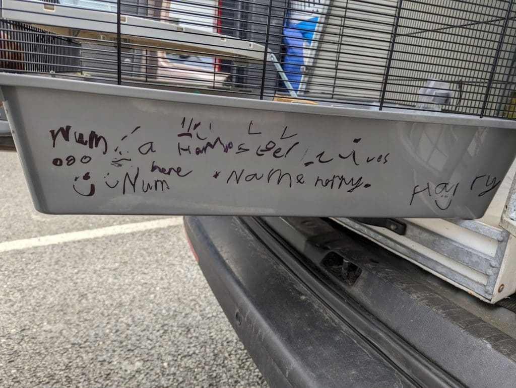 Several messages had been scribbled on the base of the cage in black pen including ‘name Harry’ ‘pick me up’ ‘I like food’ and ‘do not destroy.’