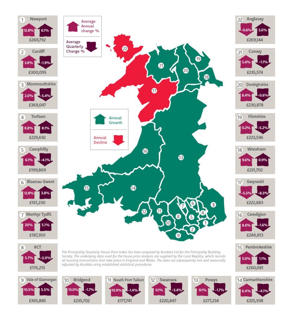 The figures have been released from Principality Building Society’s Wales House Price Index for Q1 2023 (January-March), which demonstrates the rise and fall in house prices in each of the 22 local authorities in Wales.