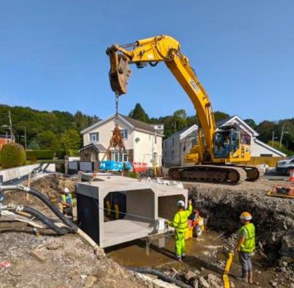 The project came in two phases with the first at Lancaster Close where 600 metres of pipework were laid from a new-build intake structure to the main road, going through fields and discharging into the River Neath.