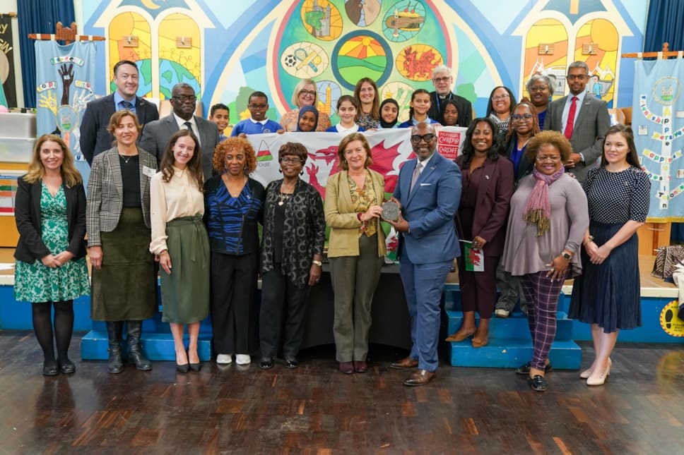 As part of the visit, the First Minister and the American guests presented the City of Birmingham Seal to pupils at St. Mary The Virgin Church in Wales Primary School, in Butetown, Cardiff today. The seal was a gift from the Mayor of Birmingham.