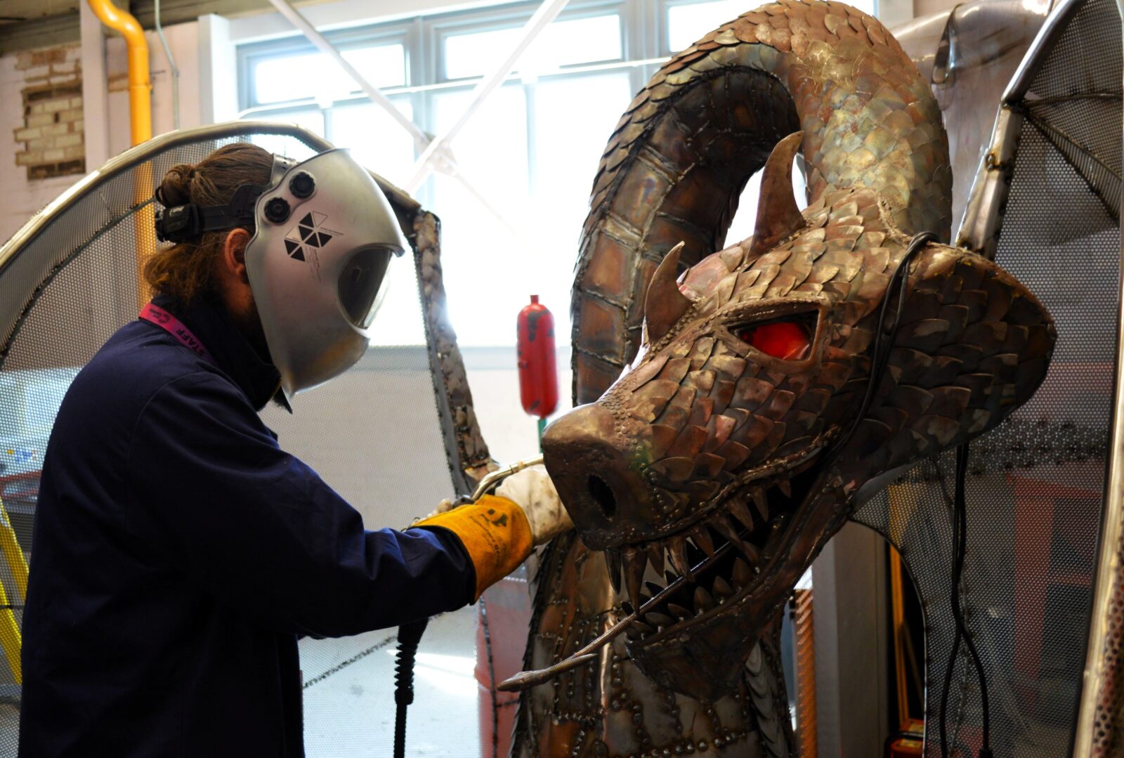 After almost four years of hard work by lecturer John Freeman and students, the hand-crafted statue of a dragon protecting a small child has taken its place outside Coleg Cambria’s Bersham Road site in Wrexham.