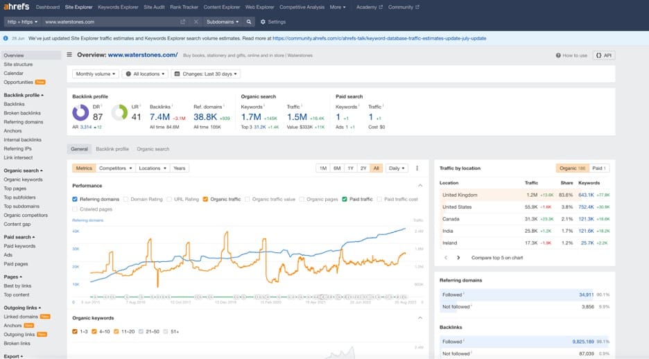 The best way to identify host websites is to explore your niche closely using available SEO tools. Let’s imagine that you’re a UK bookstore seeking to grow your online presence. By using platforms like Ahrefs, it’s possible to identify a market leader, let’s say Waterstones, and explore their existing backlinks for target ideas and inspiration.