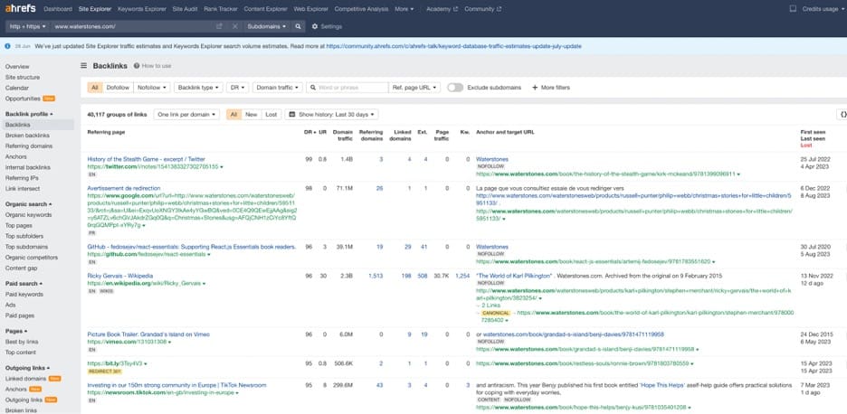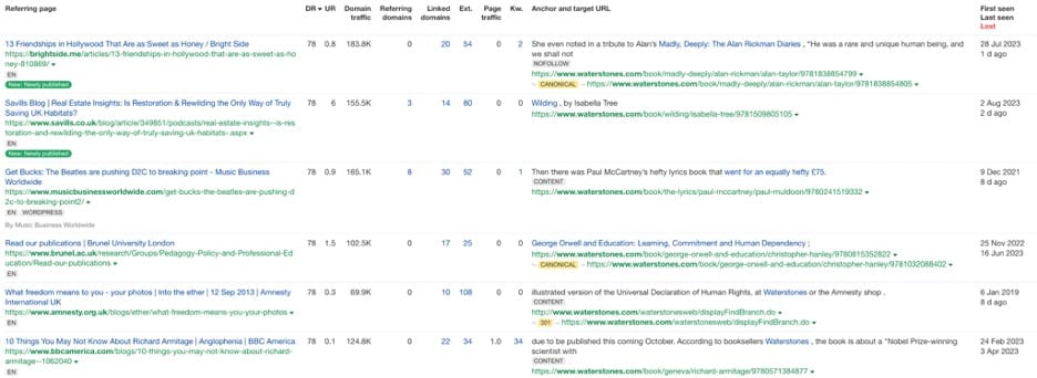Using Ahrefs’ Site Explorer, we can see that Waterstones.com is a major website with an extremely high domain rating and around 10 million backlinks online. To explore these more, we’ll click on the ‘Backlinks’ option on the sidebar to explore Waterstones’ referring domains in greater detail.