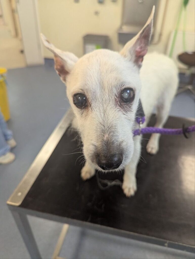 Snoopy on examination was fully blind in his left eye due to a mature cataract with some inflammation, his teeth were in a “very bad state” and he also had a moderate level heart murmur on the right side of his chest. He had some fur loss and reddened skin on his leg and in the armpits and groin, which the vet said was most likely due to an untreated allergic skin issue.