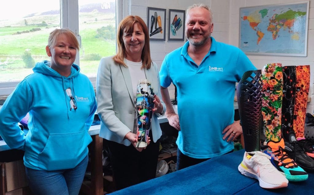 North Wales Minister Lesley Griffiths has seen the impressive work taking place at an award-winning Conwy design and manufacturing company dedicated to producing stunning prosthetic leg covers.