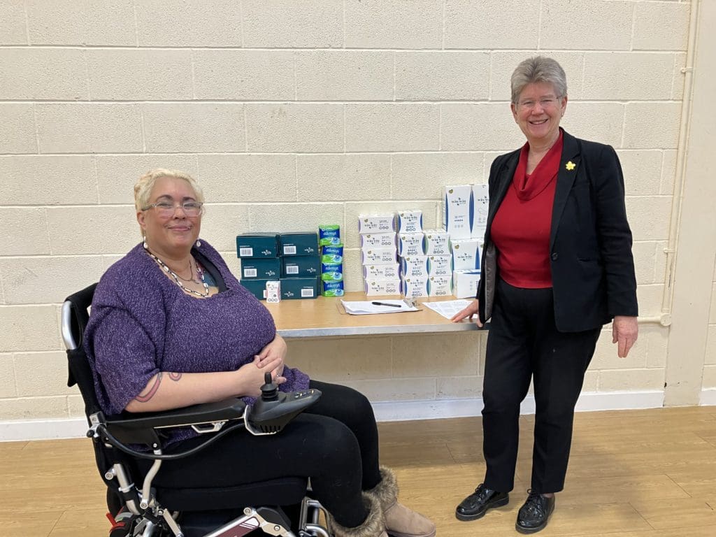 Minister for Social Justice, Jane Hutt and Dee Dickens who has campaigned for period dignity, at Glyncoch Community Centre, with free period products available to those who need them.