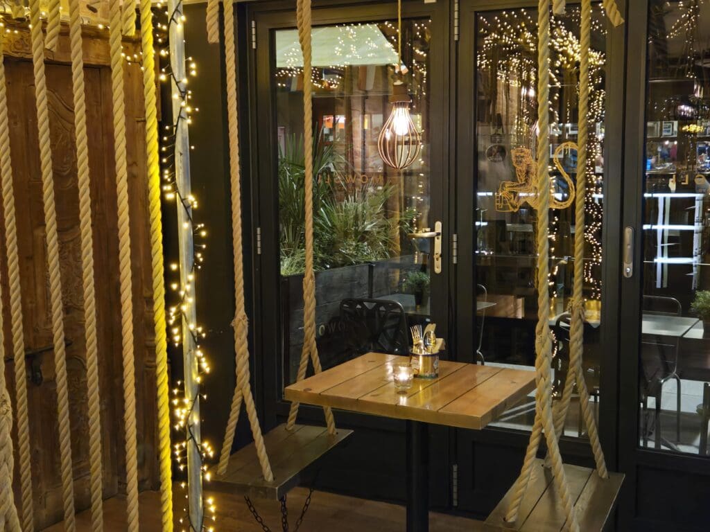 From the moment you step inside, Mowgli’s charm is evident. The unassuming exterior gives way to a warm, quirky interior filled with bohemian vibes. Think fairy lights, rustic wood accents, and even swing seats—perfect for those looking for a playful dining experience. While we skipped the swings this time, they are a must-try on a return visit!