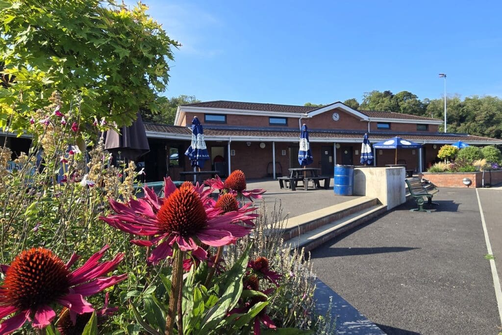 The hub is a community facility in a modern building. It features a cafe open to the public, a meeting room and changing rooms for sports activities.