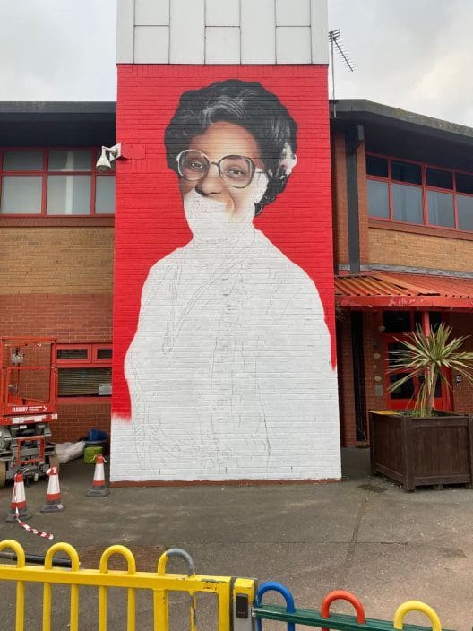 A giant mural of Betty Campbell MBE is taking shape atMount Stuart Primary School in Butetown, after children from the school wanted to honour Wales’s first black headteacher.