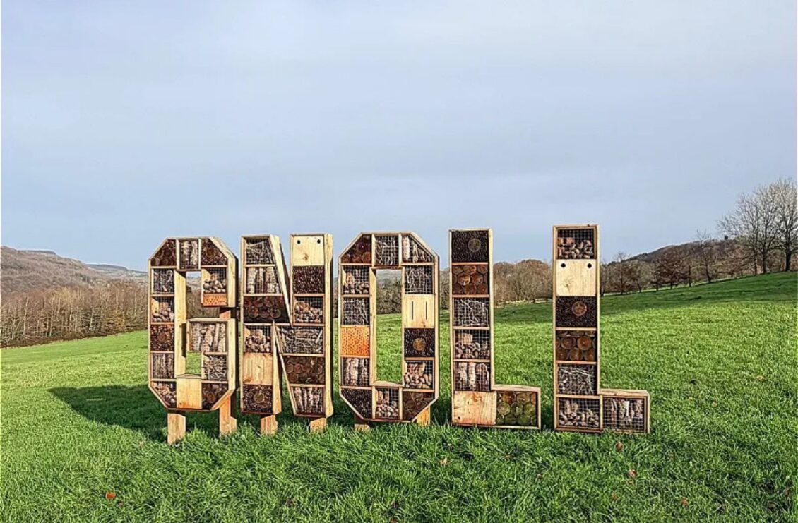 This striking installation is far more than a visual landmark, it’s a haven for wildlife. The giant letters double as a bug hotel, offering safe nesting and hibernation spaces for pollinators and other insects. Close inspection reveals small holes filled with mud and leaves - clear evidence that solitary bees have already used the structure to safely store larvae over winter, helping to secure future pollinator populations.