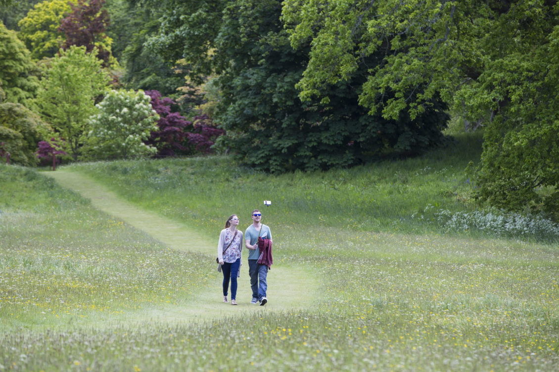 Visitors at Bodnant Garden, Conwy, Wales. Bodnant is a breathtaking garden with grand terraces and views of Snowdonia. Credit: Chris Lacey