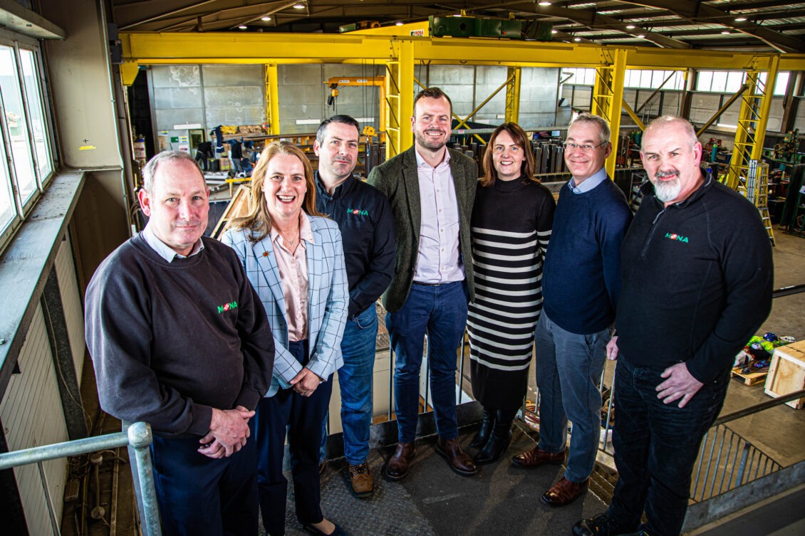 Mona Group directors Steven Jones, Gethin Rees Jones and Robin Evans alongside MP for Ynys Môn, Virginia Crosbie and representatives of the Green Digital Academy on-site at Mona Group HQ in Llangefni.