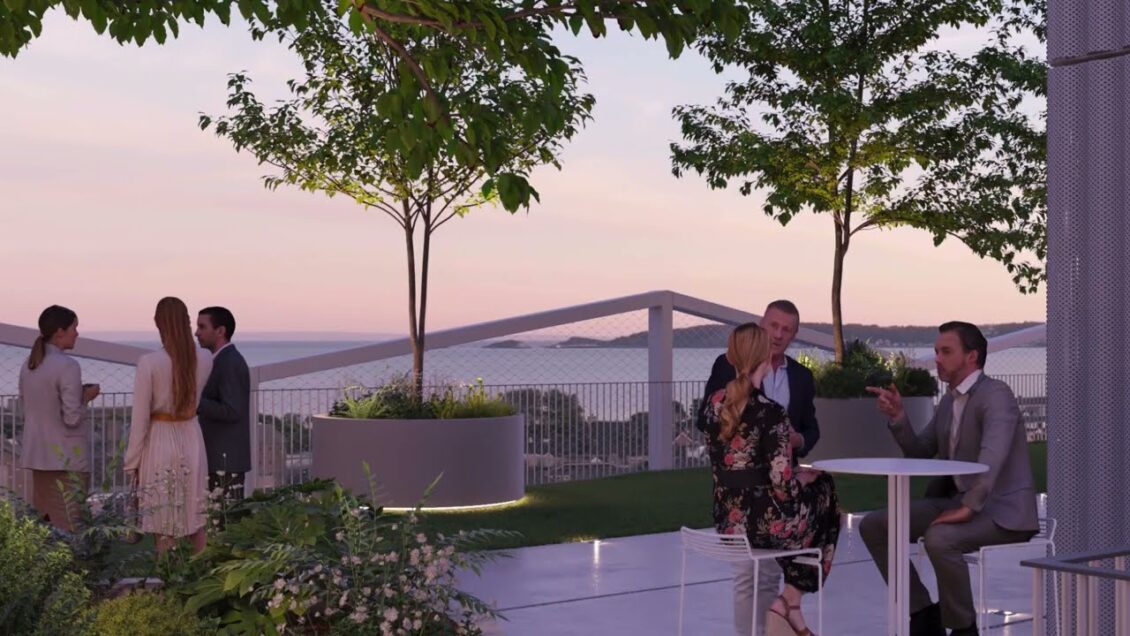 It includes conceptual footage of the reception area, office spaces, balconies, networking areas and rooftop terrace with views over Swansea Bay.