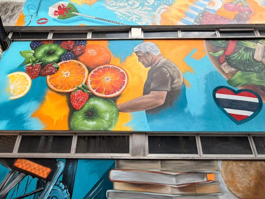 “The mural celebrates the Market Quarter as loudly and proudly as we do!  Our historic market has stood in Pontypridd for over 200 years and is the perfect fusion of history, nostalgia, modern design and a varied shopping and socialising experience. Cafes your grandparents or grandparents will remember stand alongside modern Indian, Thai and Italian street food. There is something for everyone. All local businesses and local people working to provide the very best for customers. The best part of the Market Quarter is that you never know what you will find – so why not pay it a visit!”