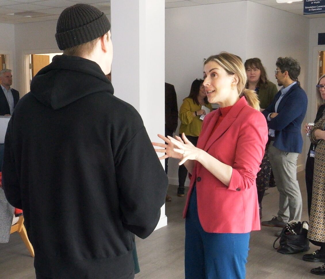 Minister for Mental Health and Wellbeing Sarah Murphy meeting Simon Martin from Heads Above the Waves, a not-for-profit organisation that raises awareness of depression and self-harm in young people, at Swansea University