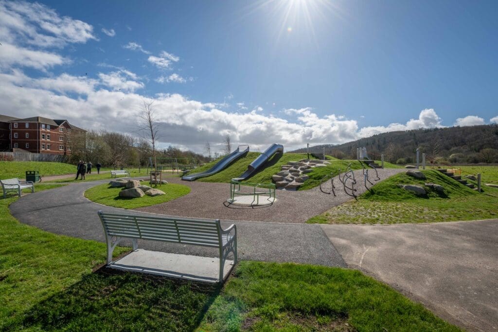 With a new 3-metre-high grassed mound at its heart, the play area features three slides, as well as climbing platforms, an ‘aero tilt’ spinner, an accessible ‘roto roko’ spinner, a wheelchair accessible roundabout, two new junior swings, a basket swing, and a range of other natural play features such as boulders and tunnels.