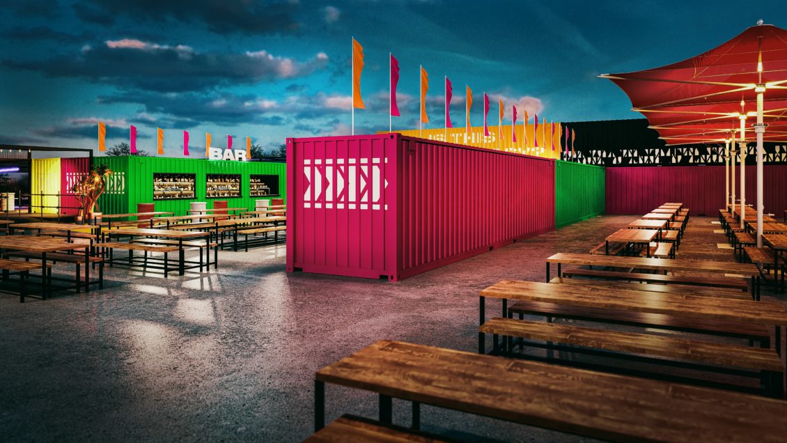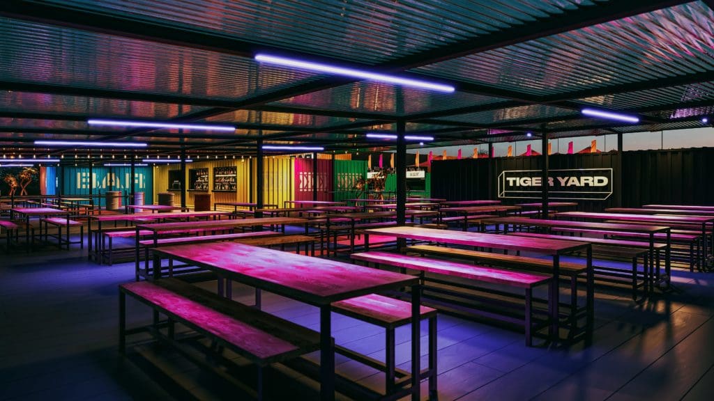 By using 22 rainbow-coloured shipping containers to create the bars, kitchens, toilet blocks and some seating areas, Tiger Yard is now ready to welcome a total of 1,000 covers at a time.